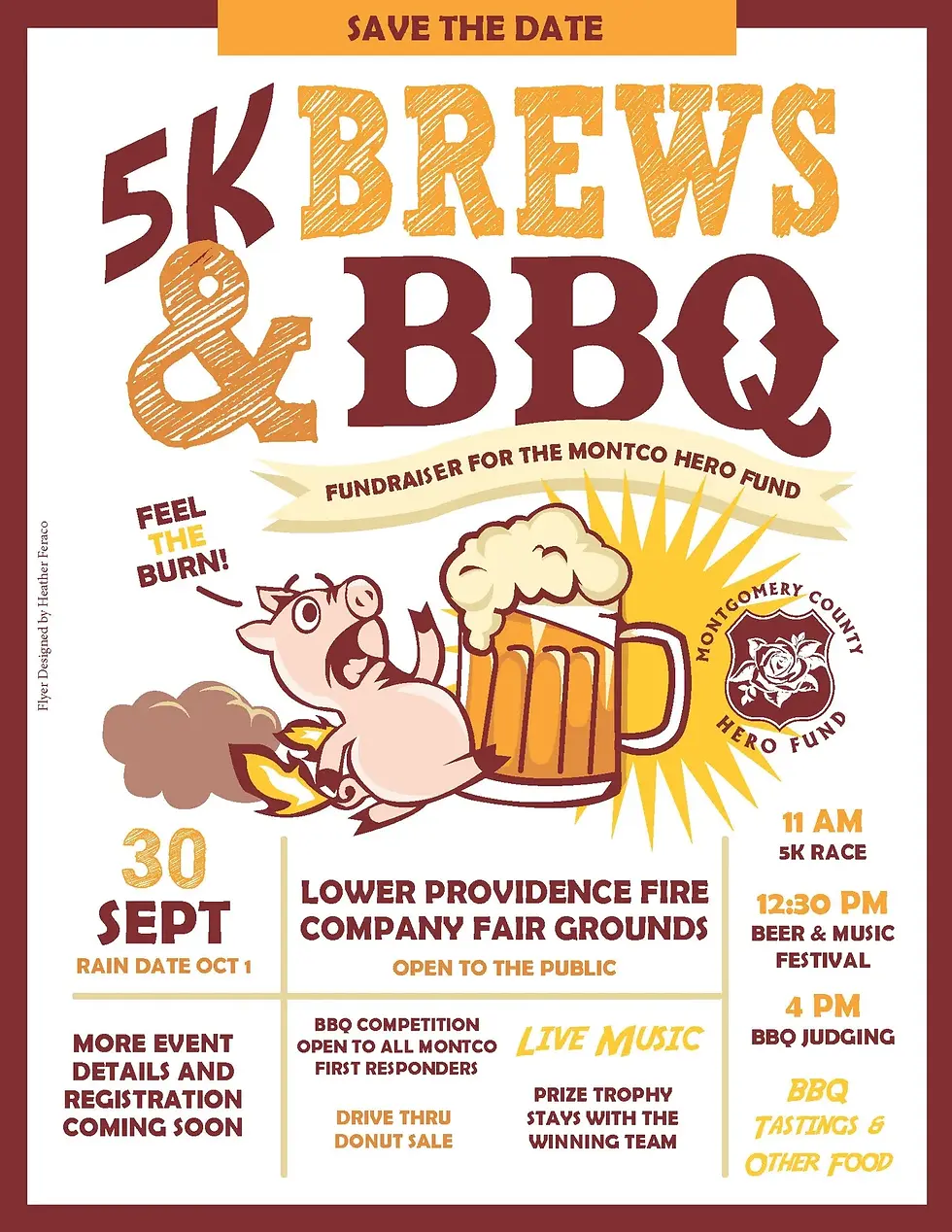 Join us on Saturday, September 30, 2023, for 5K Brews & BBQ at the Lower Providence Fair Grounds, 3199 Ridge Pike, Eagleville, PA 19403.